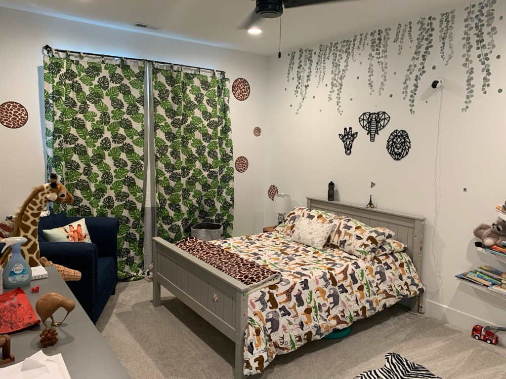 For my son’s 3rd birthday, I surprised him with this Jungle Room. He was absolutely obsessed with animals at the time, constantly setting up all his animal figurines to make “buddy parties”, carrying them around with him on his adventures, correcting everyone when they dared call a lemur a monkey or a leopard a cheetah.