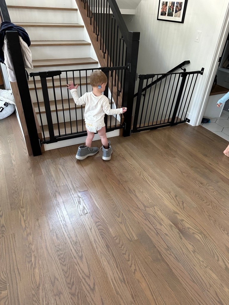 These gates match my stair railing, are easy open for adults but tricky for kids to figure out, self-closing but can also easily prop open for convenience, and don’t damage your house on install 💪🏼